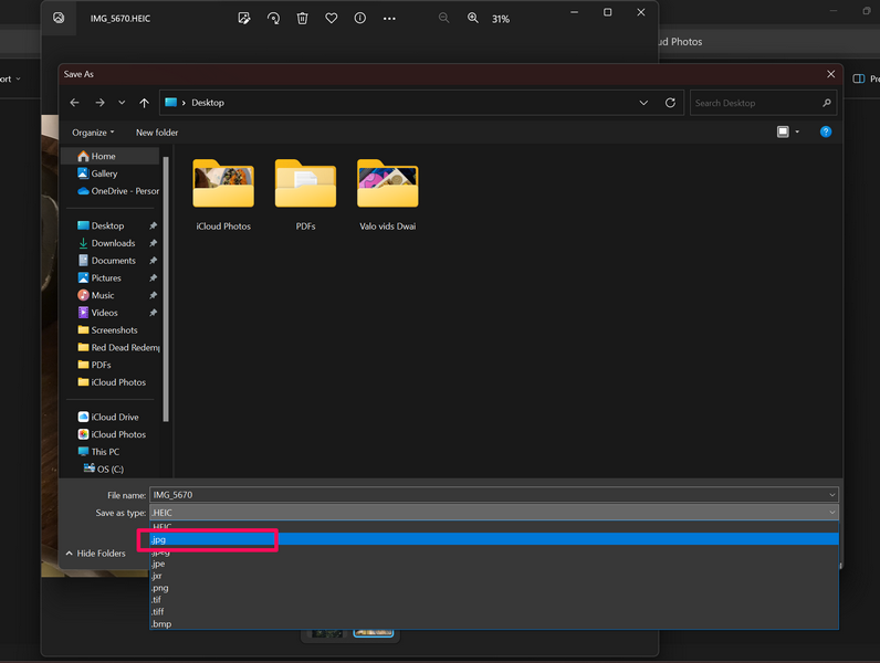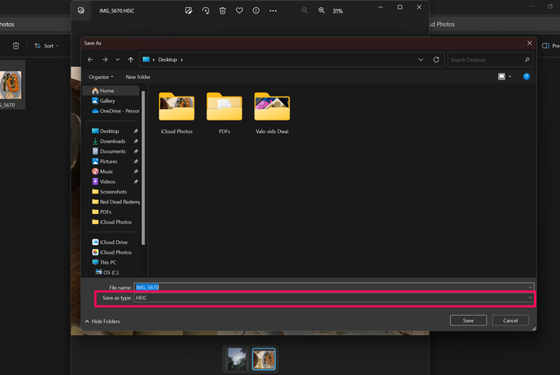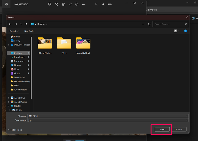 2.Fotoğraflar uygulamasında açılan HEIC görüntüsü ile klavyenizde Ctrl + S tuşlarına basın.Tasarruf etmekpencere.