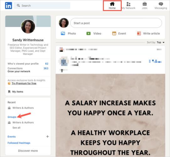 - GitEvLinkedIn ana sayfasında sekme ve seçinGrupsol alt tarafta.