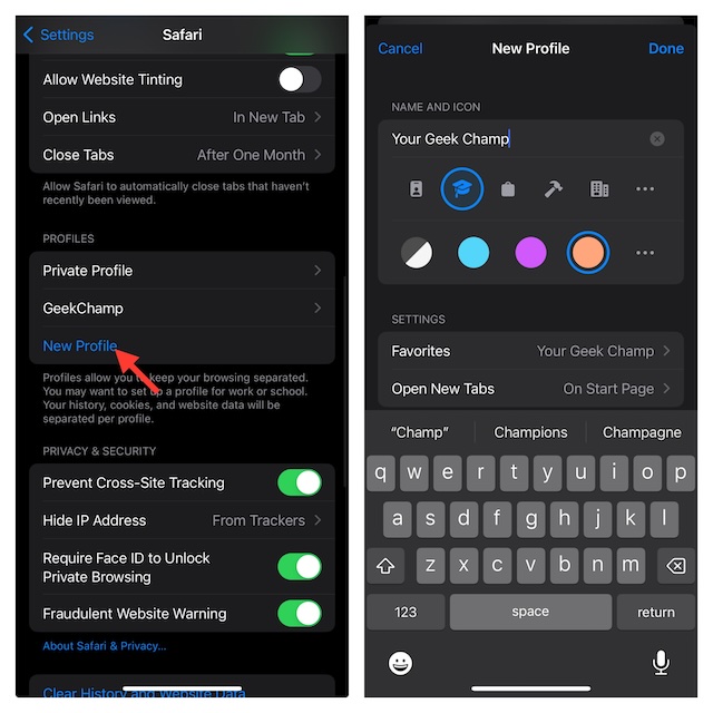 - Profilinizi adlandırın, bir sembol seçin ve zevkinize uygun bir renk seçin. Ayrıca yapabilirsinizSafari profilinin ayarlarını ayarlayınyer imlerine hızlı erişim için tercih edilen bir klasör seçmek için favorilere dokunma gibi.