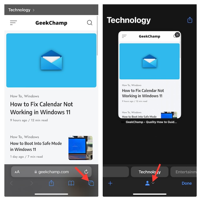 - Öncelikle, lansmanSafariiPhone'unuzda. Ekranın sağ alt köşesindeki sekme değiştirici menüsüne basın.