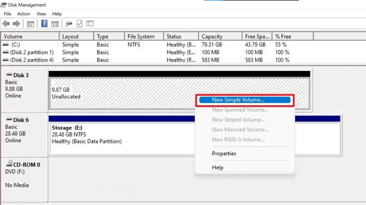 - Sürücüyü "Ayrılmamış”Ve"Yeni Basit Hacim" seçenek.