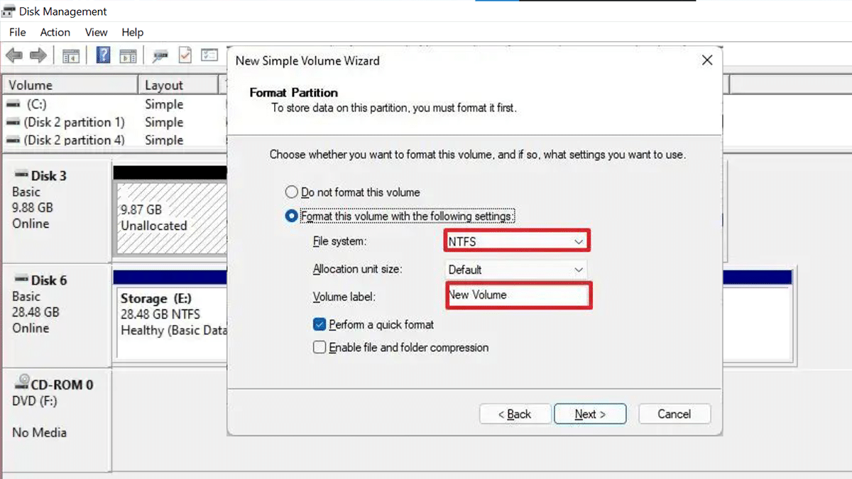 - Bittiğinde,Disk yönetimibölümün üzerinde bölümü oluşturacak ve biçimlendirecekSSDveyaHDDWindows 11'de depolama.