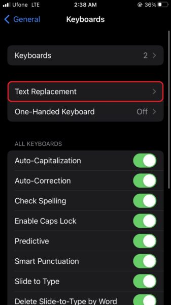 - AltındaKlavyeMenü, denilen bir seçenek bulacaksınızMetin değiştirme. Metin kısayollarınıza erişmek için üzerine dokunun.