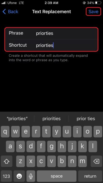 Şimdi, metin değiştirme için bir kısayol oluşturabilirsiniz.