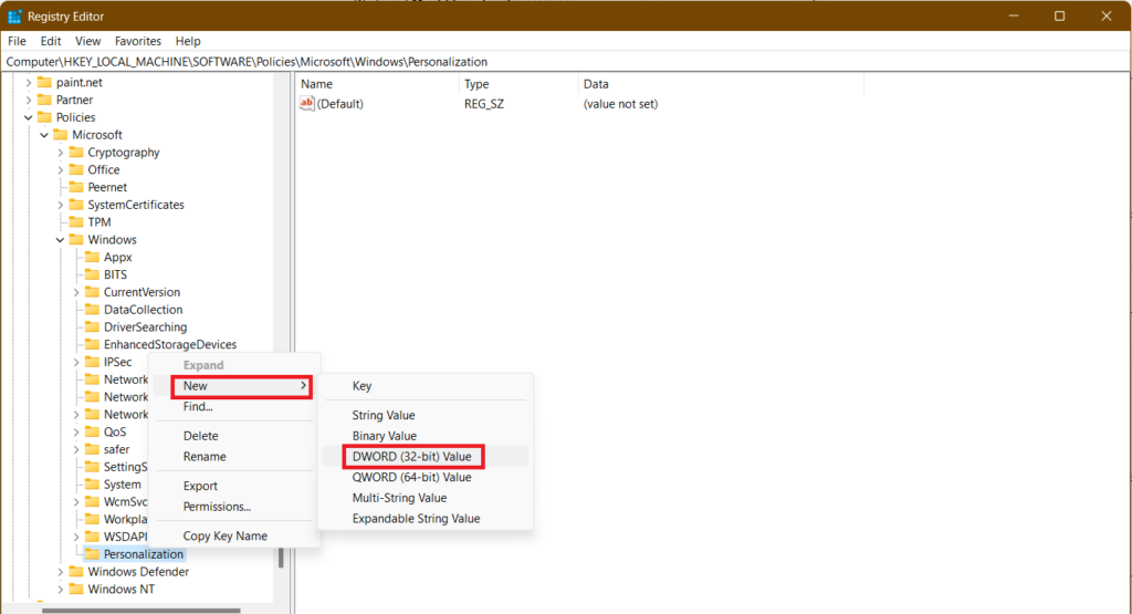 5.Sağ tıklayınKişiselleştirmeve seçYeniardındanDWORD (32 bit) değer.