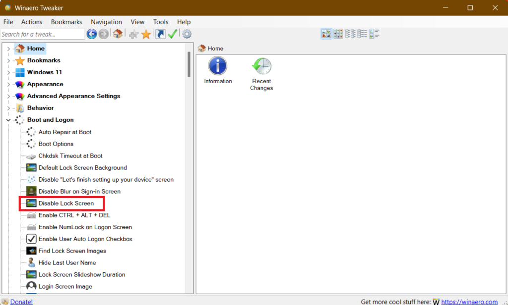 Ayrıca, kullanıcının avantajı için Winaero Tweaker, Windows 11'deki kilit ekranını devre dışı bırakmak için doğrudan bir seçenek sunarak kayıt defteri anahtarlarına girmenizi veya karmaşık ilke ayarlarında gezinmenizi sağlıyor. Winaero Tweaker'ı kullanarak kilit ekranını nasıl devre dışı bırakabilirsiniz: