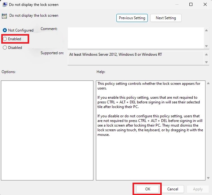Kayıt Defteri Düzenleyici gibi, Grup İlkesi Düzenleyicisi de kilit ekranı ayarlarını yönetmek için merkezi bir yol sağlar. Ayrıca, kayıt defterine kıyasla daha kullanıcı dostu bir arayüz sunar ve ayrıca önceki yöntemin son adımında yaptığımız manuel değer yaratma ihtiyacını da ortadan kaldırır. Grup ilkesi düzenleyicisini kullanarak Windows 11'deki kilit ekranını devre dışı bırakmak için bu adımları izleyin: