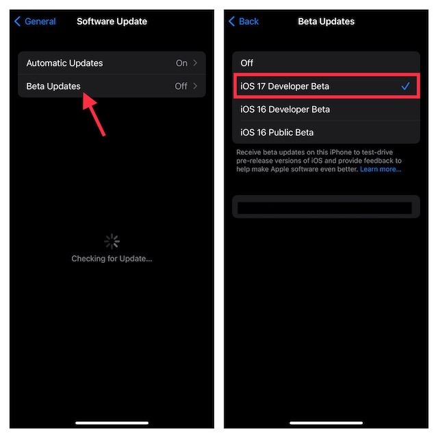 - Bir sonraki ekranda seçiniOS 17 Geliştirici Beta.