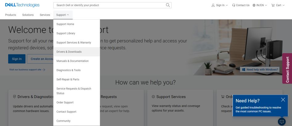 Adım 2: “Destek” ye tıklayın ve menüden “Sürücüler ve İndirmeler” i seçin.
