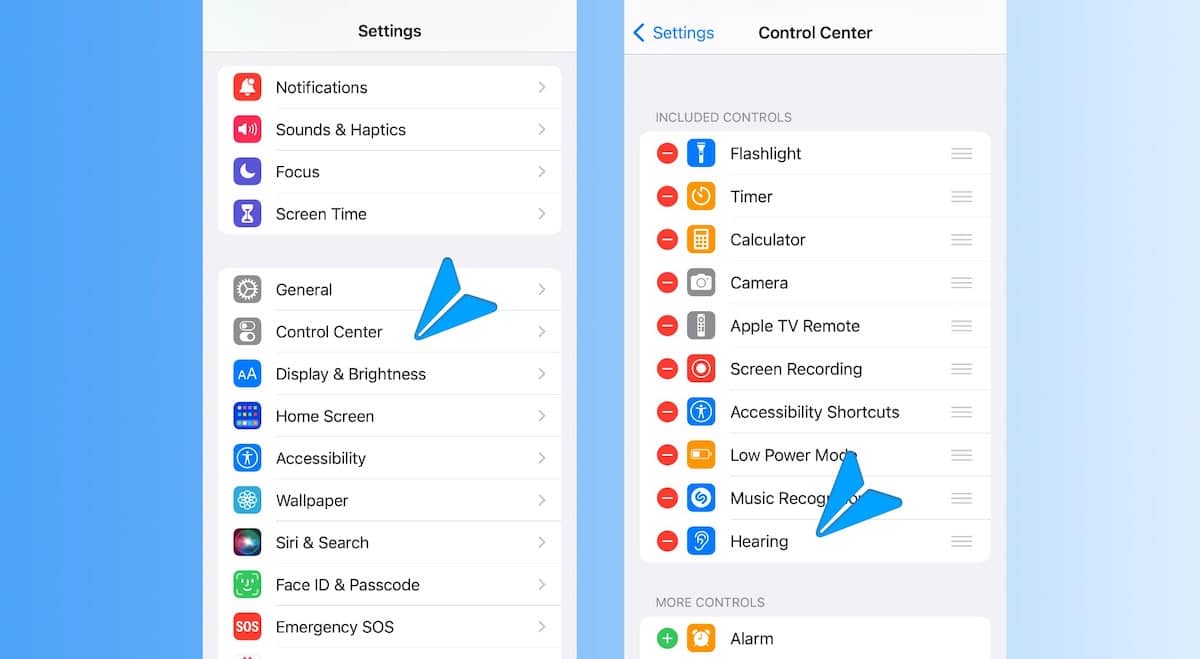 - Kontrol merkezindeki özelliğe kolayca ve hızlı bir şekilde erişmek için “Dahil Kontroller” menüsündeki “İşitme” geçişine uzun basın ve sürükleyin.