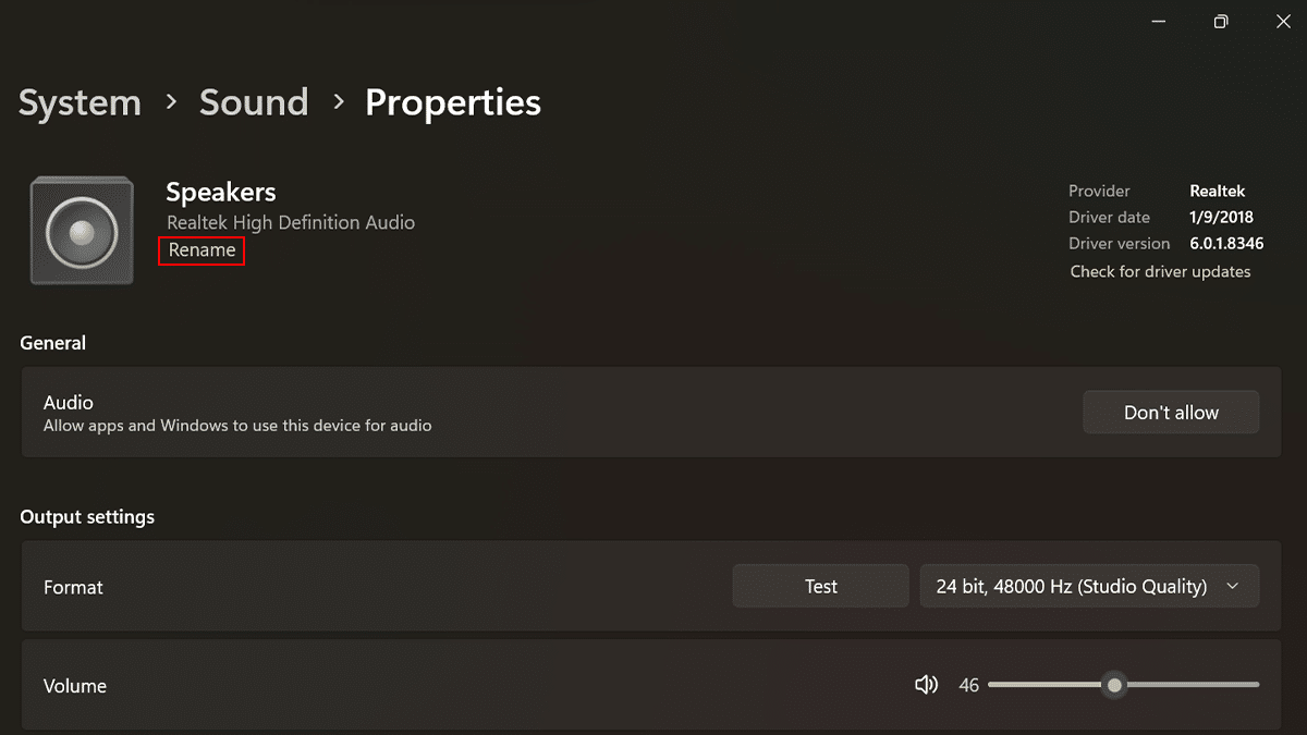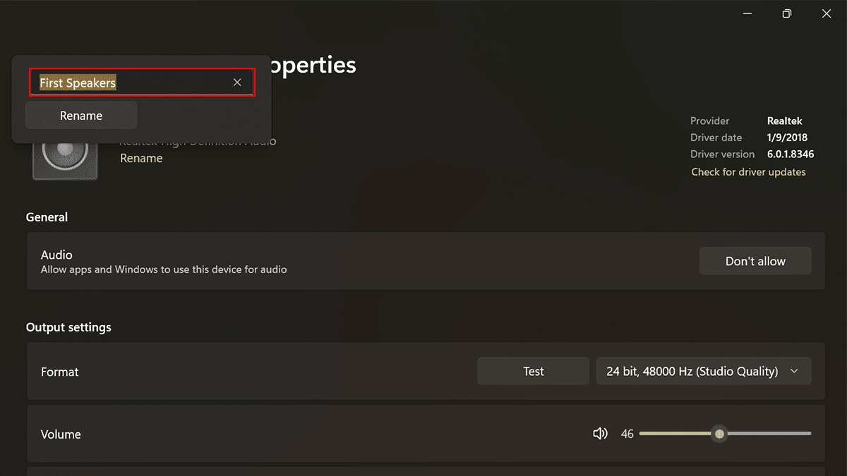 - AltındaÇıktıBölüm> Yeniden adlandırılacak hoparlörleri (veya kulaklıkları) seçin.