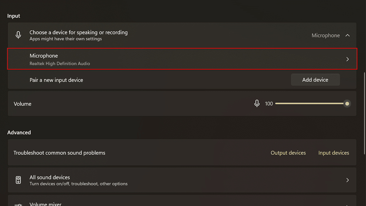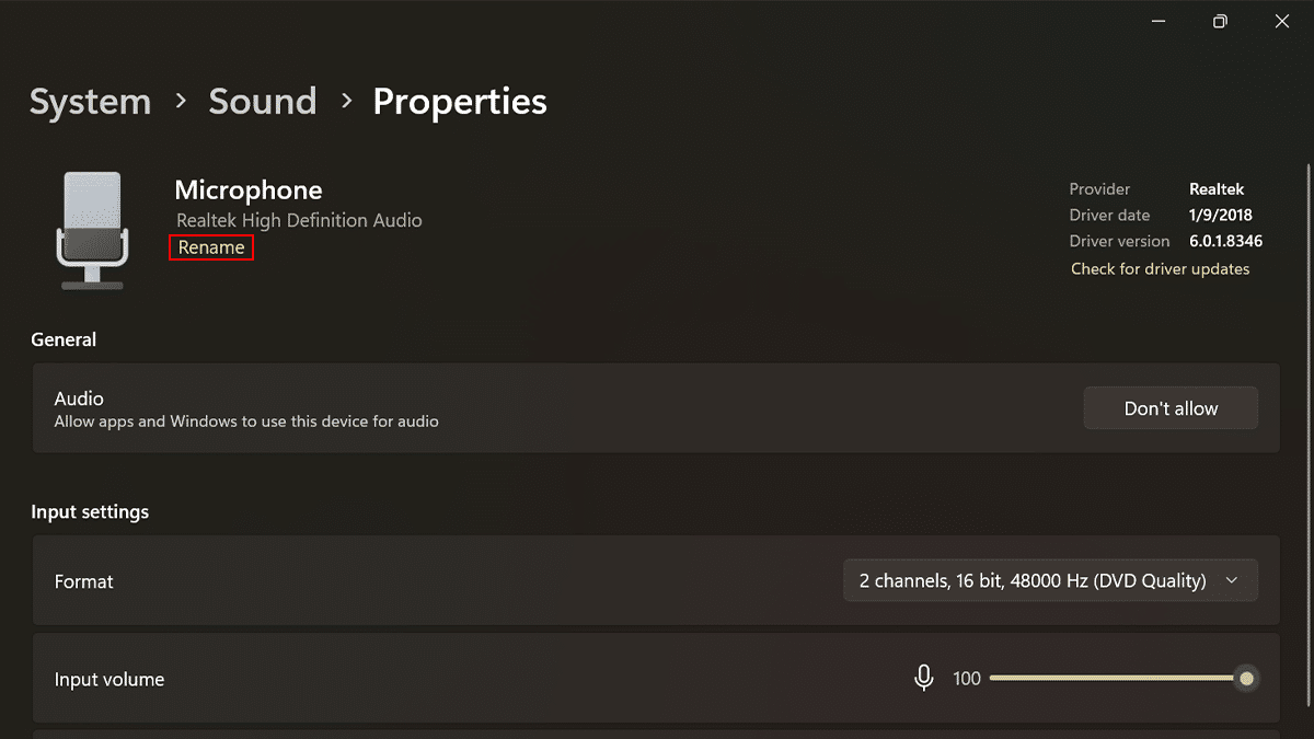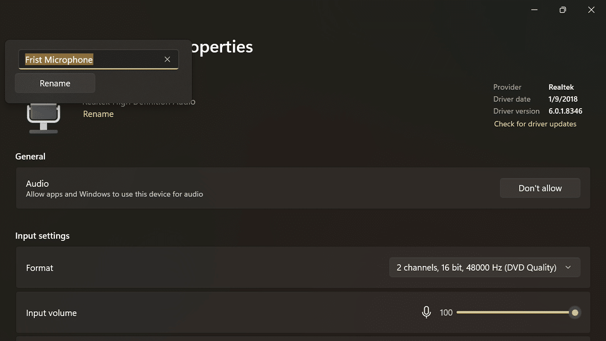 - AltındaGirişBölüm> Yeniden adlandırılacak mikrofonu seçin.