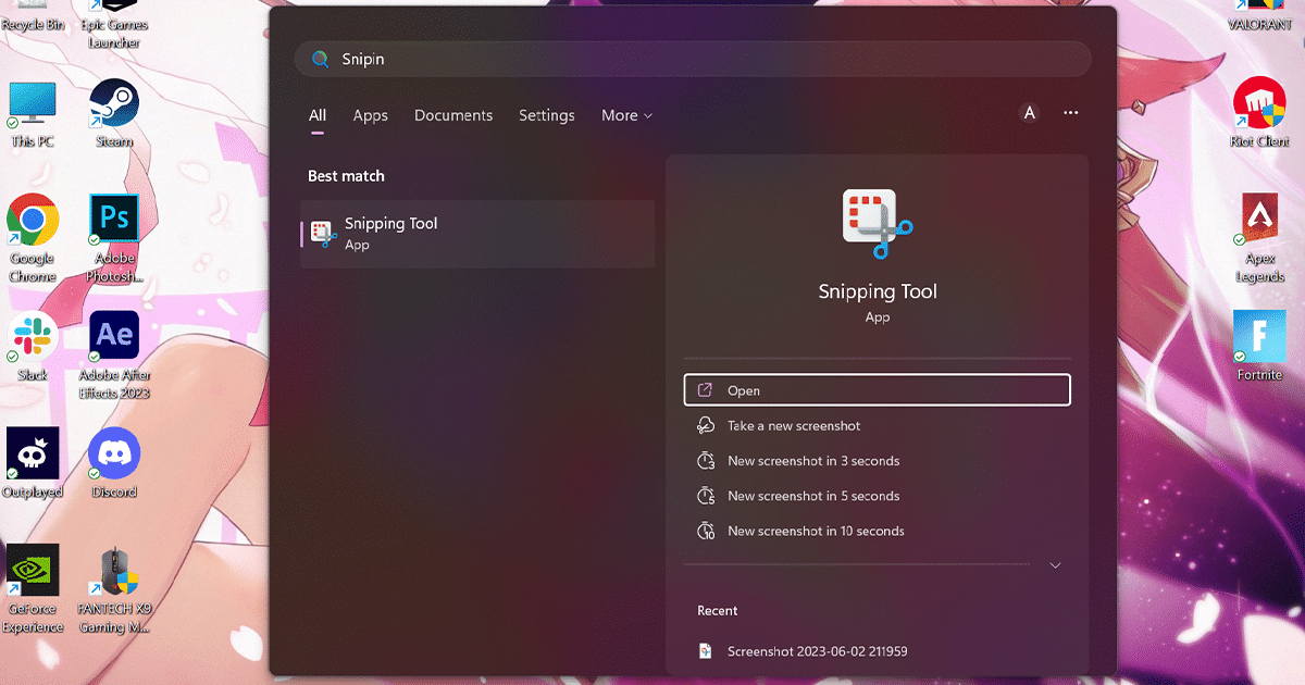 - AçıkBaşlangıç, arayınSnipping aletVe tıklayınAçıkdüğme.