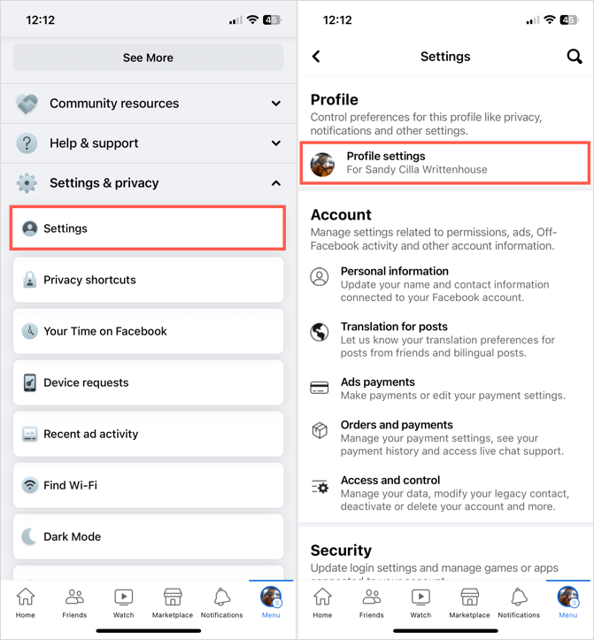 - İçindeProfilEn üstteki bölüm, seçinProfil Ayarları.