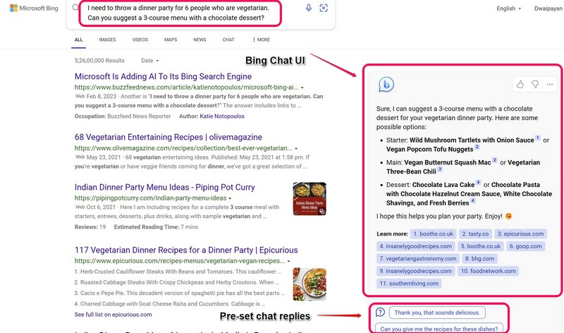 Örneğin, yeni AI ile çalışan Bing arama kutusuna ayrıntılı bir arama sorgusu yazabilirsiniz ve size ilgili bağlantılar ve referanslarla tam ayrıntıları sağlayacaktır. Sorgunuz hakkında daha fazla ayrıntı almak için Microsoft Edge'deki Bing Arama Motoru sohbet kutusuna önceden ayarlanmış yanıtlar bile gönderebilirsiniz.
