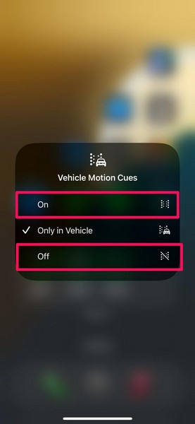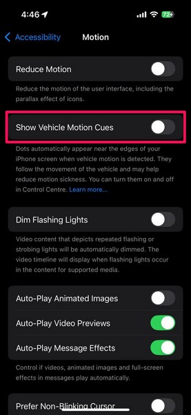 4.Buradan,OptionileAraç hareket ipuçlarını anında açıniPhone'unuzda veya kullanınKapalı SeçenekileÖzelliği tamamen kapatın.