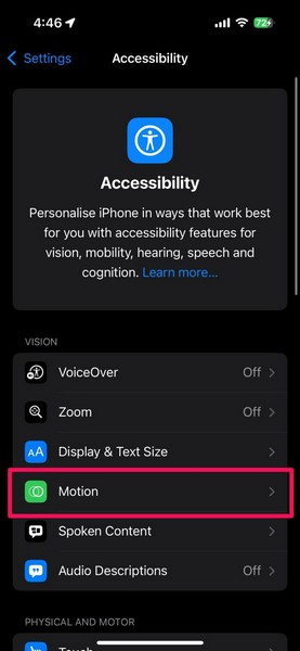 Şimdi, iPhone'daki hareket ayarları aracılığıyla araç hareket ipuçlarını etkinleştirmekAraç hareketini algıladığında cihazın animasyonlu noktaları otomatik olarak göstermesini sağlayın. Ancak, geçişi etkinleştirdikten hemen sonra özelliği açmaz.
