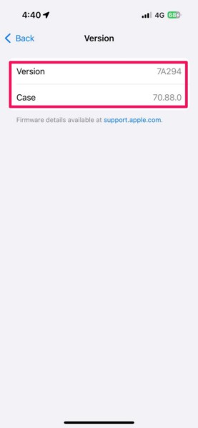 4.Kullanıcılar da yapabilirSürüm alanına dokunungörmek içinAirPods Kılıfının Ürün Yazılımı Sürümü.