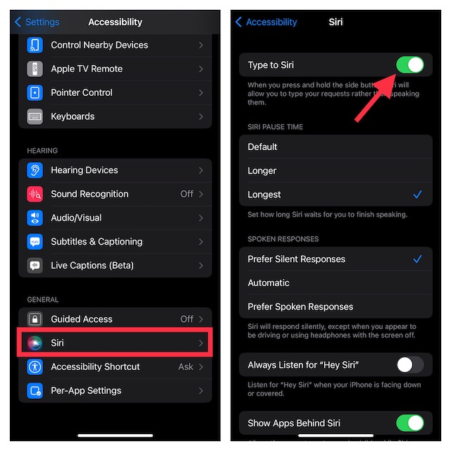 4.Ardından, geçişi açınSiri'ye yazınve Ayarlar uygulamasından çıkın.