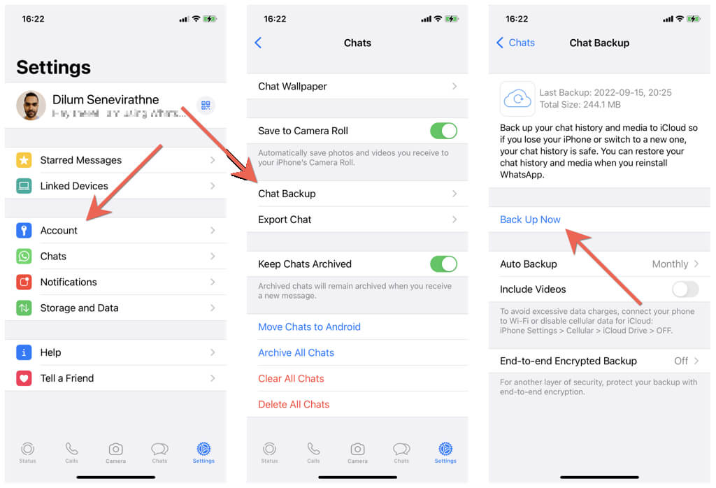 - Gidip gelmekAyarlar>Sohbetler>Sohbet yedeklemesiVe muslukŞimdi yedekleBilgilerinizi iCloud (iOS) veya Google Drive'a (Android) yedeklemek için. Anahtarı yanına çevirdiğinizden emin olunVideolar ekleyinWhatsApp video eklerini yeni telefona aktarmak istiyorsanız.