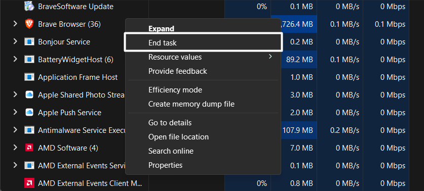 Ayrıca 7-ZIP uygulamasını görev yöneticisinden kapatıp yeniden başlatabilirsiniz. Bunu nasıl yapacağınızı bilmiyorsanız, aşağıda belirtilen adımlarda aynı şeyi kolaylıkla açıkladık: