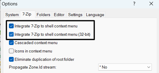 3.7 ZIP bölümünde,7 Zip Kabuk Bağlam Menüsünü EntegreVeEntegre etmek 7-ZIP Kabuk Bağlam Menüsü (32 bit)onay kutuları kontrol edilir.