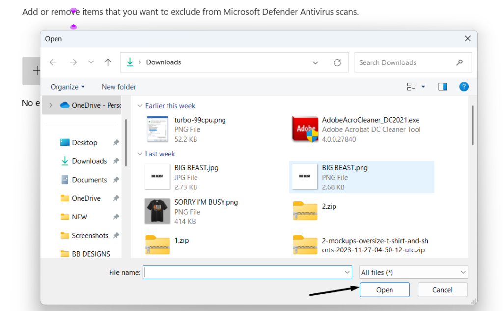 7.Oraya girdikten sonra seçin ve ardındanAçıkTaramadan hariç tutulması için düğme.