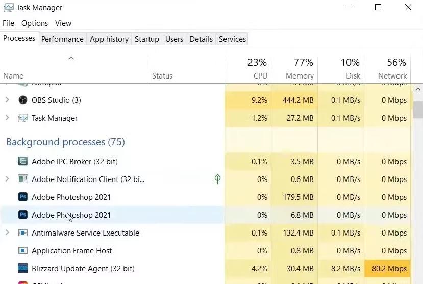 Tüm adobe süreçleri kapatıldıktan sonra Adobe Photoshop'u yeniden başlatın ve sorunun devam edip etmediğini kontrol edin.