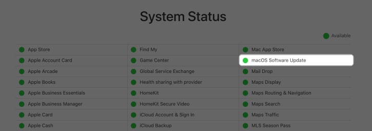 Apple'a gitSistem Durum SayfasıVe yanında yeşil bir nokta görüp görmediğinizi kontrol edinMacOS Yazılım Güncellemesi. Sarı veya kırmızı bir nokta görürseniz, Apple'ın sorunu sonlarından düzeltmek için çalıştığı anlamına gelir.