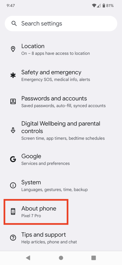 2.Şimdi açıkAyarlarAkıllı telefonunuzda ve gitTelefon Hakkında.