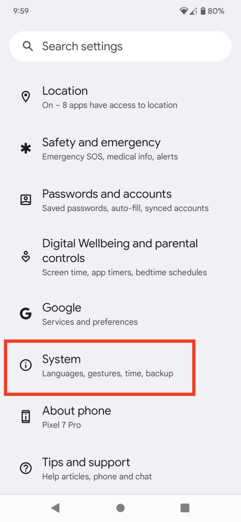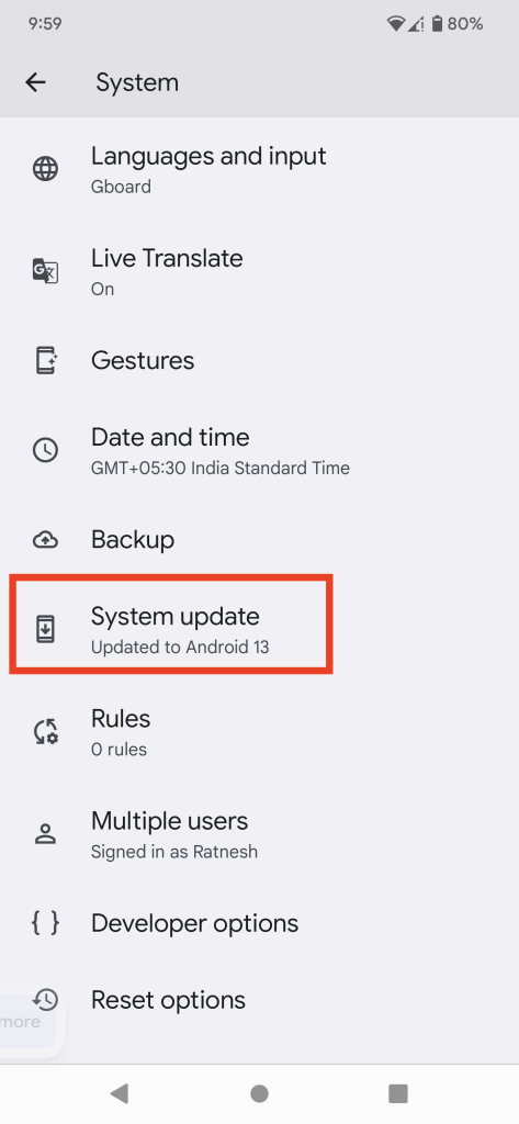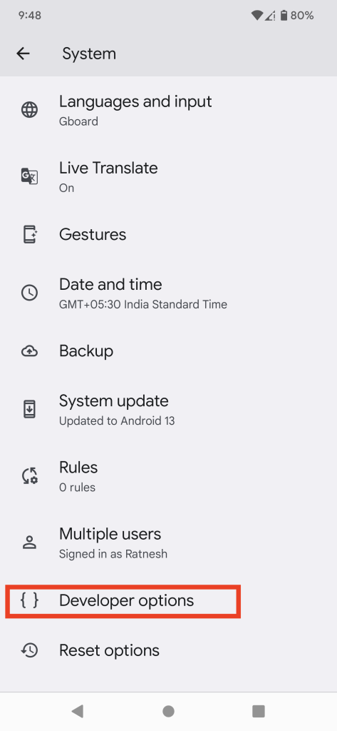 4.Ayarları bırakın ve tekrar açın. Şimdi gitSistemve seçGeliştirici seçenekleri.