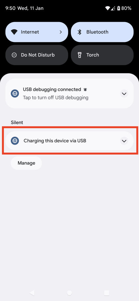 7.Bildirim tepsinizi indirin ve üzerinde bu cihaz seçeneğini şarj ederek USB'yi tıklayın.