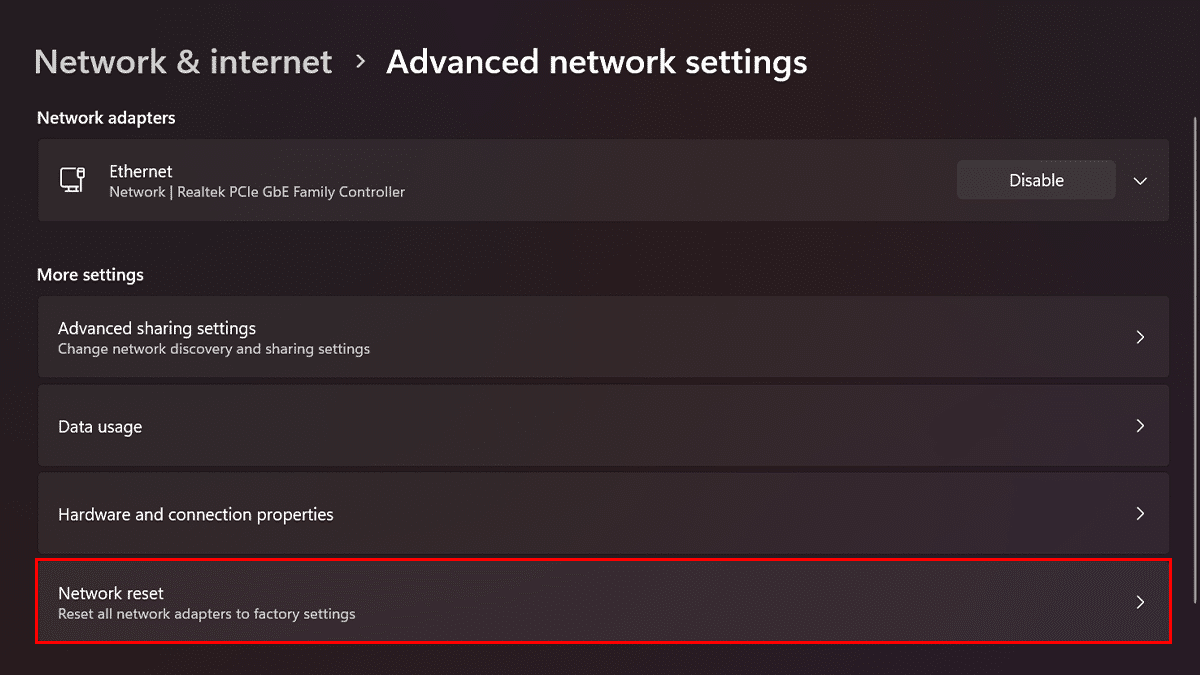 Ağ sorunu ne olursa olsun, Windows 11, Ethernet adaptörlerinin sürücüyü ve yavaş veri transferleri de dahil olmak üzere birçok bağlantı problemini çözmek için bir sıfırlama seçeneğine sahiptir.