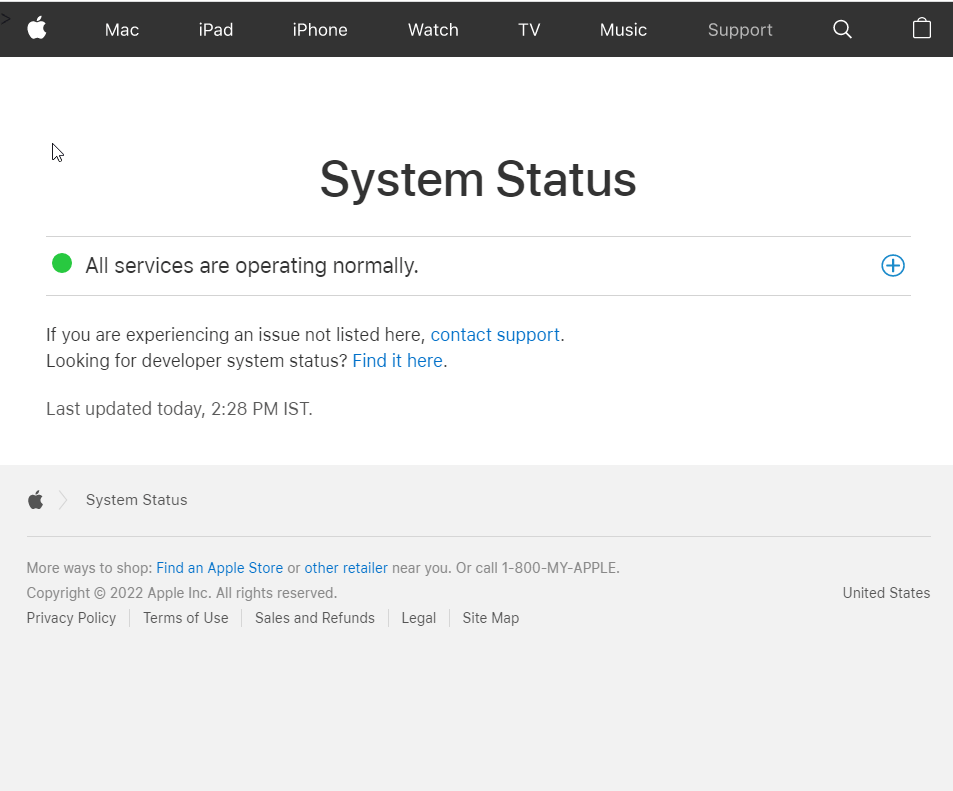 Çok yaygın bir senaryo olmasa da, uygulamanın bile App Store ve diğer sunucularla bakım etkinlikleri gerçekleştirdiği zamanlar vardır. Burada Apple sunucusunun kapalı olup olmadığını kontrol edebilirsiniz. Bunun için ziyaret edinSistem Durum SayfasıTüm hizmetlerin normal çalışıp çalışmadığını kontrol etmek için ve bir sonraki yeşil nokta var.