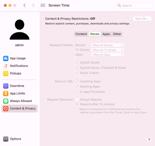 4. Sol taraftanEkran süresipencere, bulun ve tıklayınİçerik ve Gizlilik.