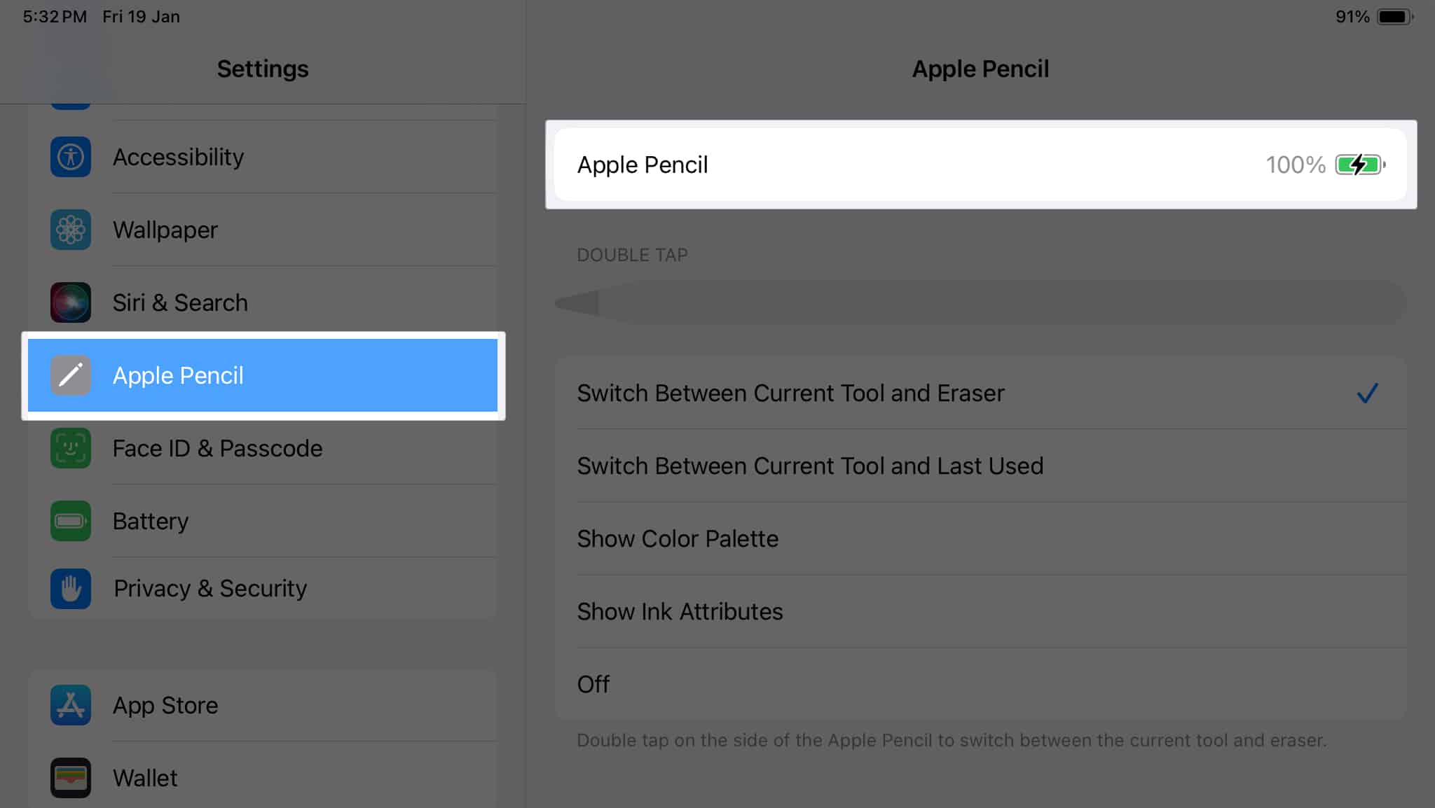 Zaman zaman, kalem bağlı ve şarj olsa bile, bildirimi üstteki göremeyebilirsiniz. Yani, onaylamak içiniPad Ayarları→ Bulabileceğinizi kontrol edinElma kalemiSol bölmede. Evet ise, dokununElma kalemi→ Sağ bölmedeki şarj durumunu arayın.