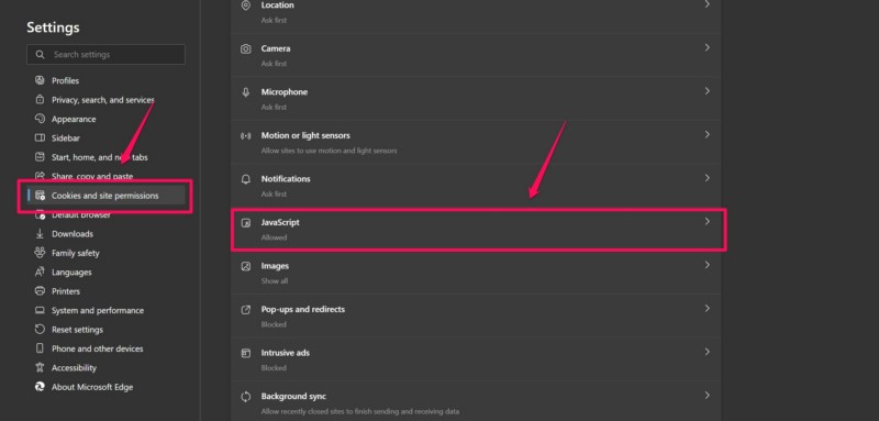 3.Ardından, tıklayınÇerezler ve Site İzinleri sekmesiSol navigasyon çubuğunda veJavaScript ayarlarıSağ bölmeden.