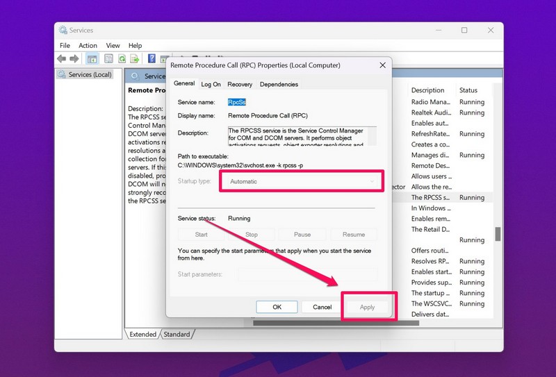 5. RPC'nin Windows Hizmetlerinde Otomatik olarak ayarlandığından emin olun