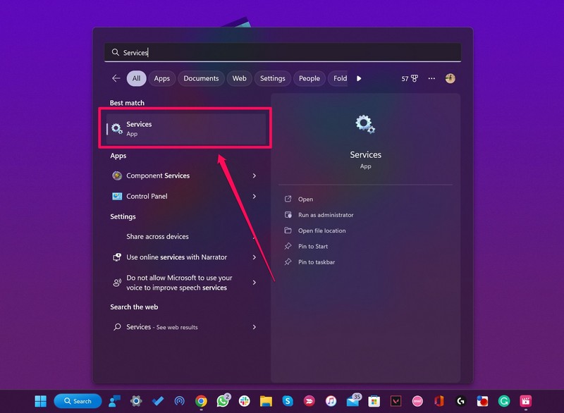 1.Arama simgesini/ çubuğunu kullanınGörev çubuğuaramak içinHizmetWindows 11 cihazınızda.