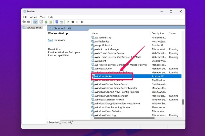 2.Hizmetler penceresi açıldıktan sonraWindows yedeklemesiSağ bölmede seçenek.