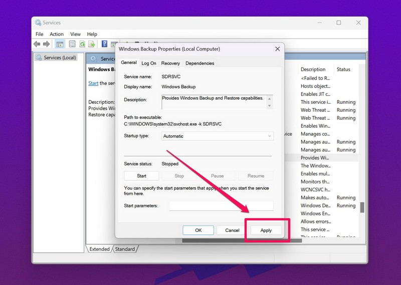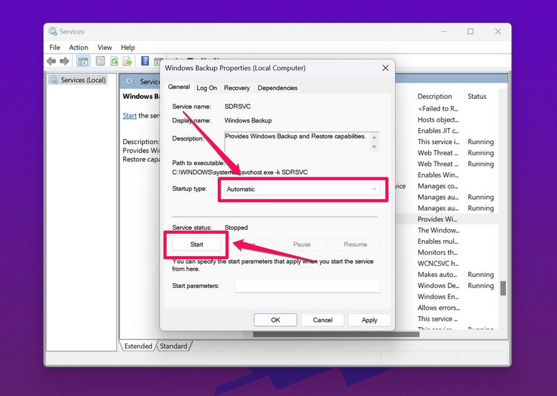 4. Windows yedekleme hizmetini manuel olarak başlatın