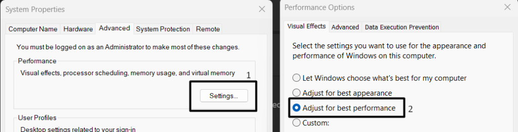 3.TıklayınAyarlariçindeki düğmePerformansbölüm Ve seçEn İyi Performansa Ayarlamaseçenek.
