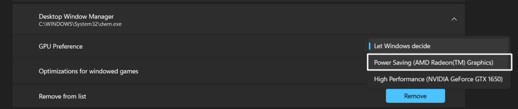 4.TıklayınMasaüstü pencere yöneticisiBölümü genişletmek ve seçmek içinGüç tasarrufuSeçenekGPU tercihiyıkılmak.