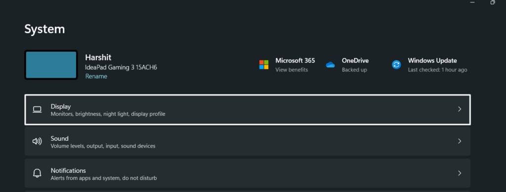 1.AçAyarlar UygulamasıBilgisayarınızda ve tıklayınGörüntülemekSeçenekSistemkategori.