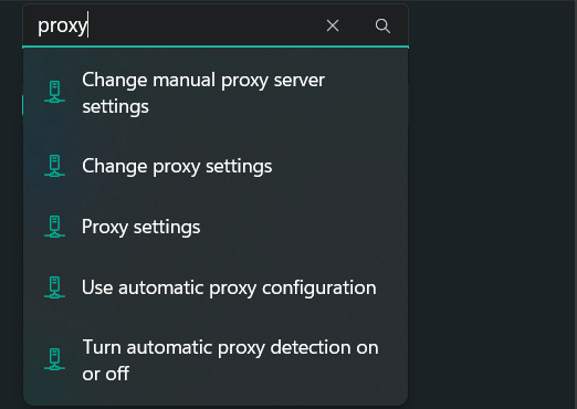 1.BaşlatmakAyarlar ProgramıWindows + I kullanarak ve arama kutusunu kullanarak bir proxy arayın.