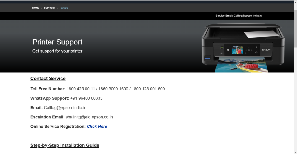 2.Bir sonraki sayfada, iletişim bilgilerini göreceksiniz.EpsonDestek ekibi. Cihazınızdaki e -posta, telefon numarası ve hatta WhatsApp aracılığıyla bunlarla iletişime geçebilirsiniz.