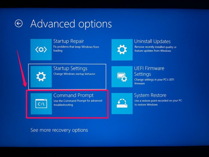 3.Gelişmiş Seçenekler sayfasında,Komut İstemi Seçeneğive açmak için Enter tuşuna basın.