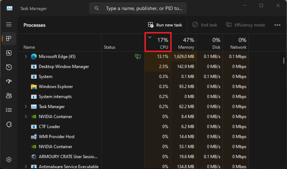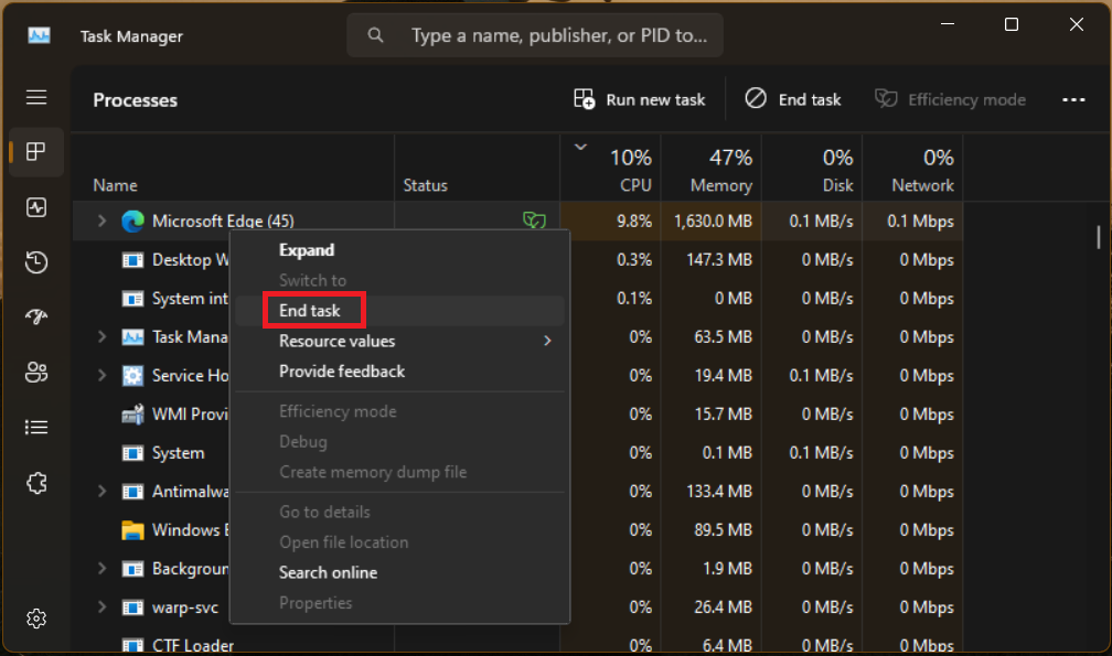Windows 11'deki Görev Yöneticisi size çalışan programların ve süreçlerin bir listesini gösterebilir. Orada, yüksek CPU, bellek, disk veya ağ kullanımı olan uygulamaları arayabilirsiniz. Windows Görev Yöneticisi'ni kullanarak çelişen programları durdurmak için bu adımları izleyin.