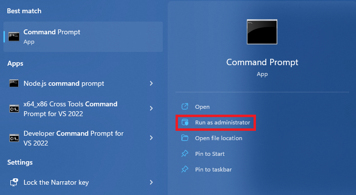 2.AraştırmakKomut istemive seçYönetici olarak çalıştırseçenek.