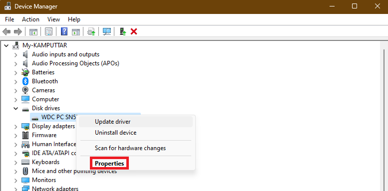 2.Aygıt sürücüsüne sağ tıklayın ve seçinÖzellikler.